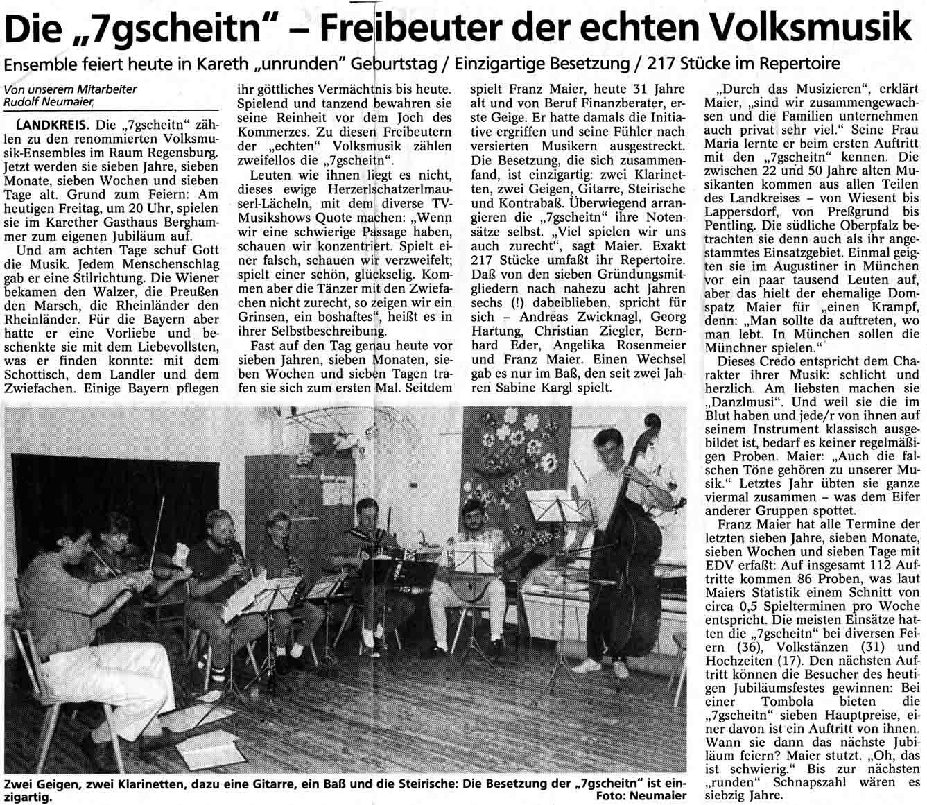 Fast auf den Tag genau heute vor sieben Jahren, sieben Monaten, sieben Wochen und sieben Tagen trafen sie sich zum ersten Mal. Seitdem spielt Franz Maier, heute 31 Jahre alt und von Beruf Finanzberater, erste Geige. Er hatte damals die Initiative ergriffen und seine Fühler nach versierten Musikern ausgestreckt. Die Besetzung, die sich zusammenfand, ist einzigartig: zwei Klarinetten, zwei Geigen, Gitarre, Steirische und Kontrabass. Überwiegend arrangieren die „7gscheitn“ ihre Notensätze selbst. „Viel spielen wir uns auch zurecht“, sagt Maier. Exakt 217 Stücke umfasst ihr Repertoire. Dass von den sieben Gründungsmitgliedern nach nahezu acht Jahren sechs (!) dabeiblieben, spricht für sich - Andreas Zwicknagl, Georg Hartung, Christian Ziegler, Bernhard Eder, Angelika Rosenmeier und Franz Maier. Einen Wechsel gab es nur im Bass, den seit zwei Jahren Sabine Kargl spielt.